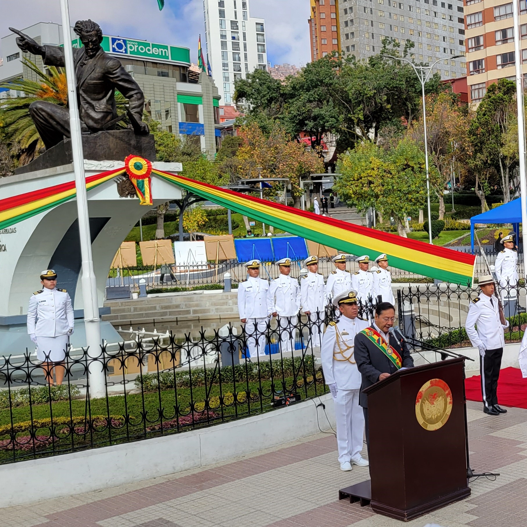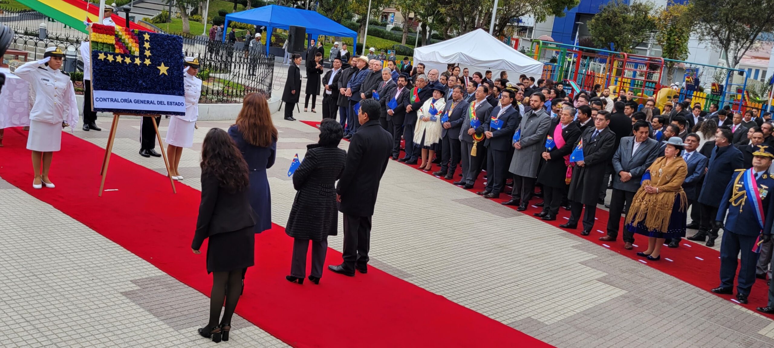 La Paz, 24 de marzo (GCI).- La Contralora General del Estado a.i., Nora H. Mamani Cabrera, acompañada por el Subcontralor de Empresas Públicas, Lic. Delfín Ponce, y la Gerente de Comunicación Institucional, Lic. Paola Rocha, hizo entrega de la ofrenda floral en honor a los héroes de la Guerra del Pacífico en la plaza Abaroa, el domingo 23 de marzo.